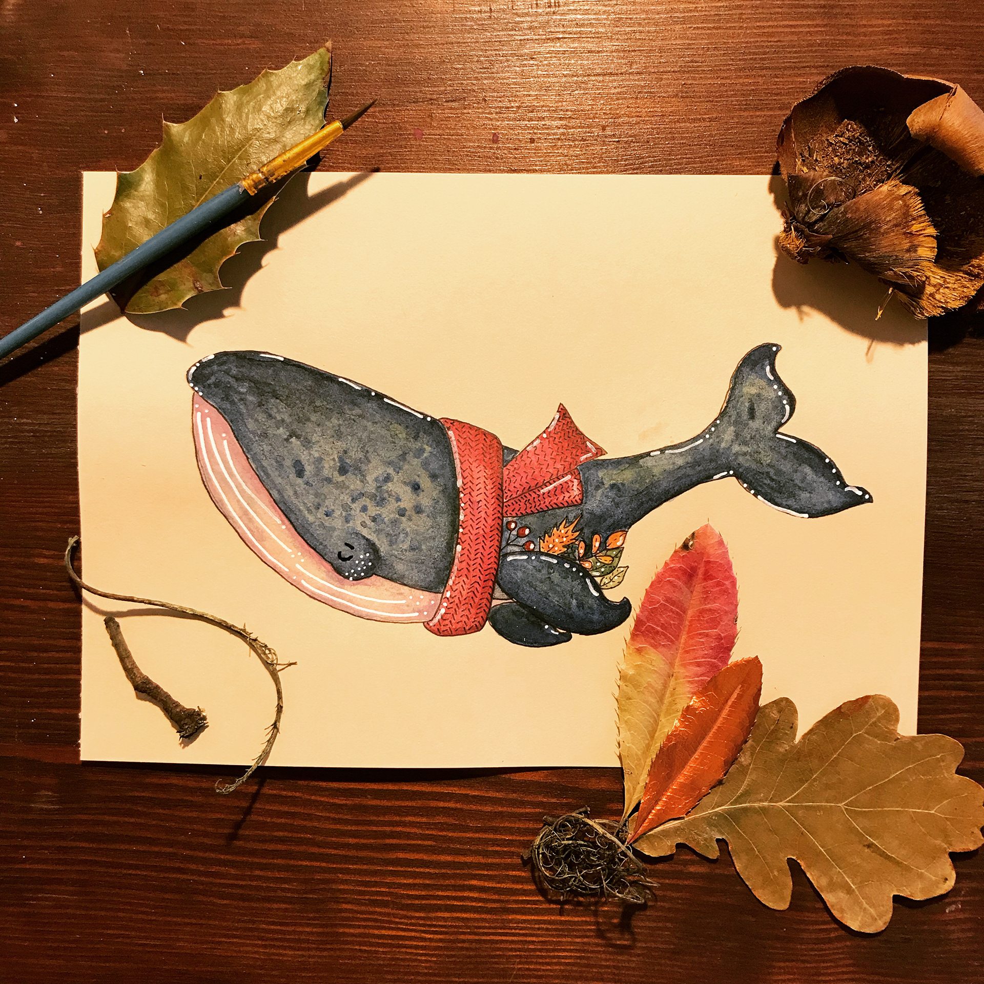 the autumn Whale is prepared for the Scarff season and accessorized herself with the perfect dry leaves and plants to swim in the fall. Acrylic painting over beige paper 300g A5.